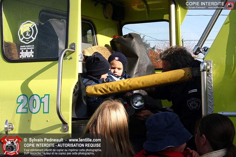 Visite de prévention dans une garderie. Un pompier met l'uniforme de combat complet tout en expliquant les différents morceaux. Les enfants visitent ensuite le 201 à l'extérieur.